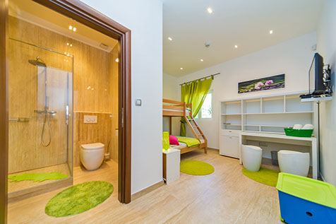 Ground floor: nice living room opening onto the terrace and swimming pool, a modern and fully equipped kitchen, two bedrooms with ensuite bathroom (one with a king size bed and the second one with bunk beds), bathroom.