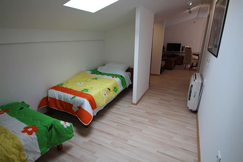 This is a modern studio apartment (36m²) with a sleeping area with 2 single beds and bathroom.