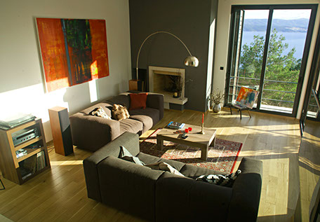 Ground floor offers a comfortable living room with a fire place, a dining and a fully equipped kitchen opening onto the terrace and the infinity pool with a magnificent view to the sea, the nearby islands and mountains. Storage room & guest toilet.